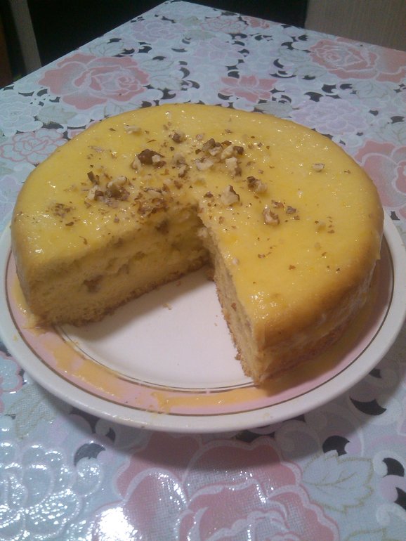 Решила вчера вечером,что у нас в организме не хватает тортика.Испекла бисквит,сварила лимонный курд,наколола грецких орешков.И вуаля!)))