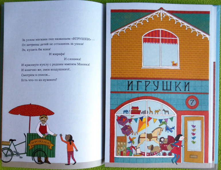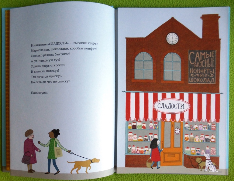 Книга создает массу возможностей для «развивающих диалогов» с ребенком, как по тексту, так и по рисункам. Также по книжке можно выучить порядковый счет до 10, т.к. каждый магазинчик пронумерован.