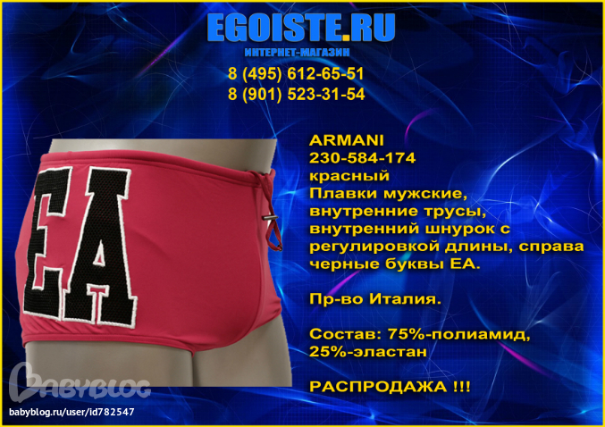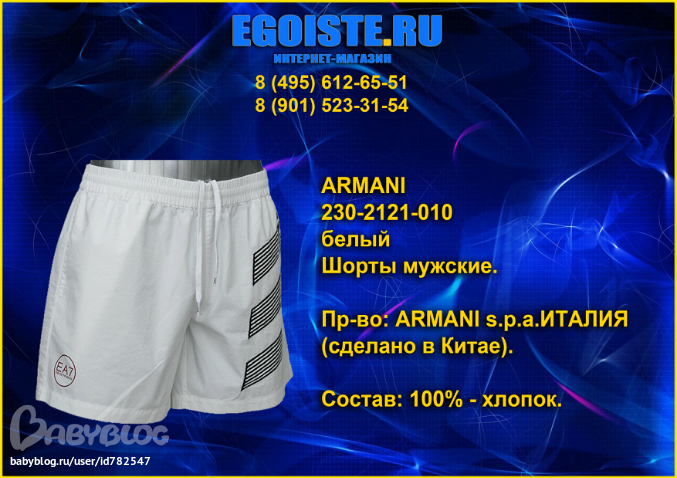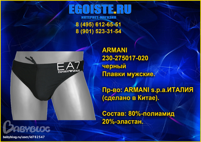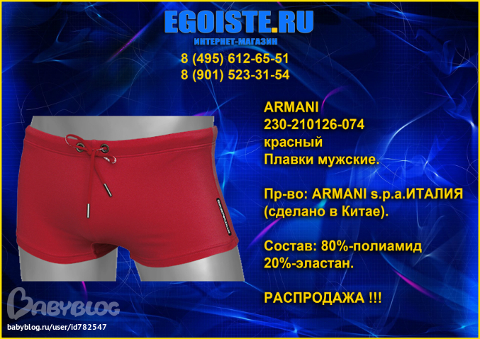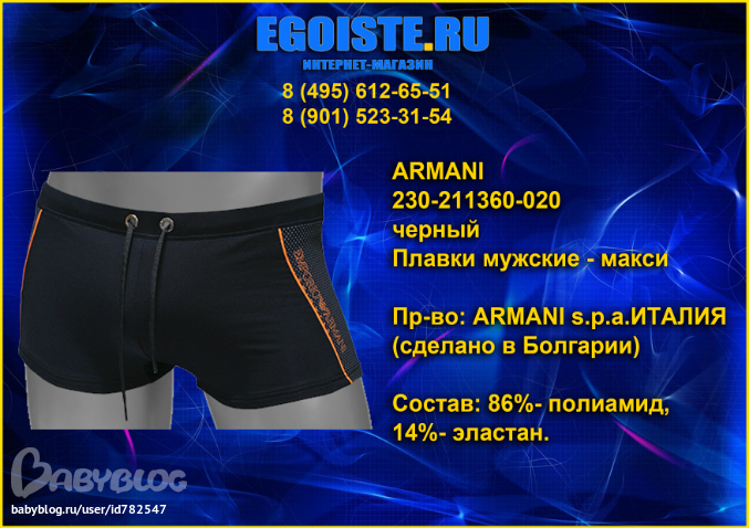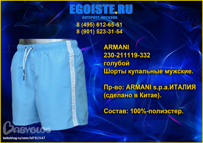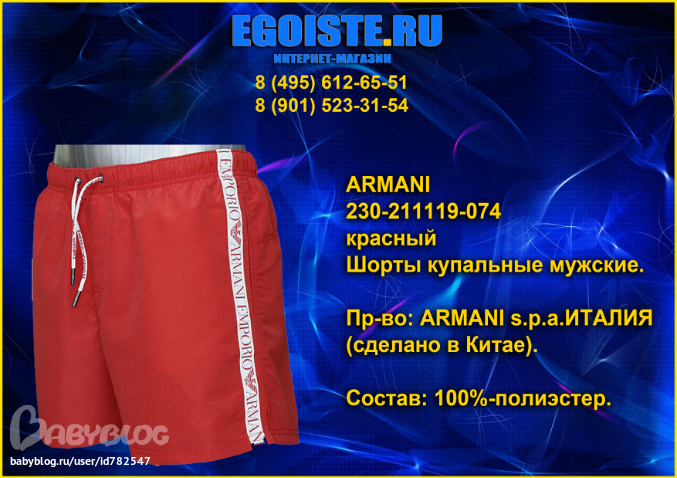 Заказав плавки или шорты Armani в нашем интернет-магазине, мы осущевствим доставку по Москве или России в самые кратчайшие сроки. Вся продукция представленная в нашем онлайн-магазине EGOISTE.RU в наличии.