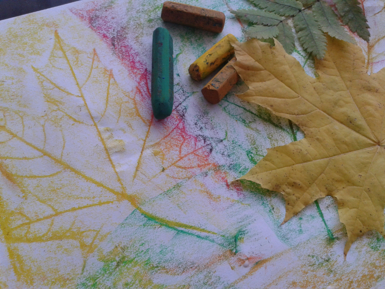 Синие листочки очень уж красивыми получались. И мы с дочкой договорились, что это не настоящие листики, потому что синими листочки не бывают (по крайней мере кленовые). На этом дочка и разрешила использовать синие мелочки.