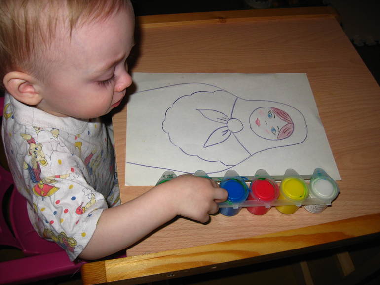 Перед ужином дошло дело и до матрешки. Раскрашивал пальчиками. Порадовало, что почти не заехал за края, кисточкой у него так ровно не получается. Правда он оторвался на столе и себе, после пришлось отмываться в душе.
