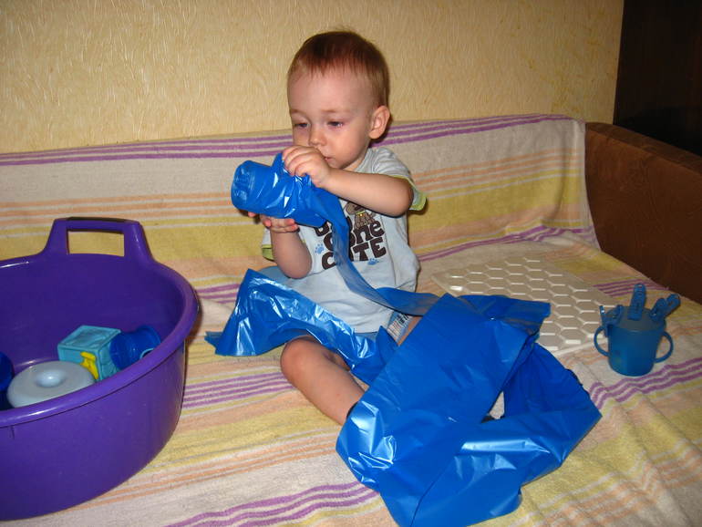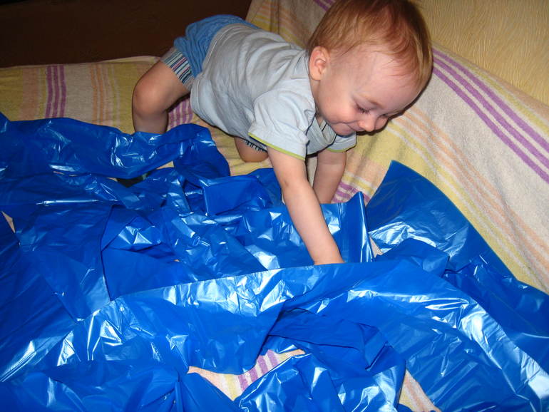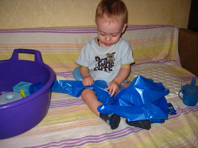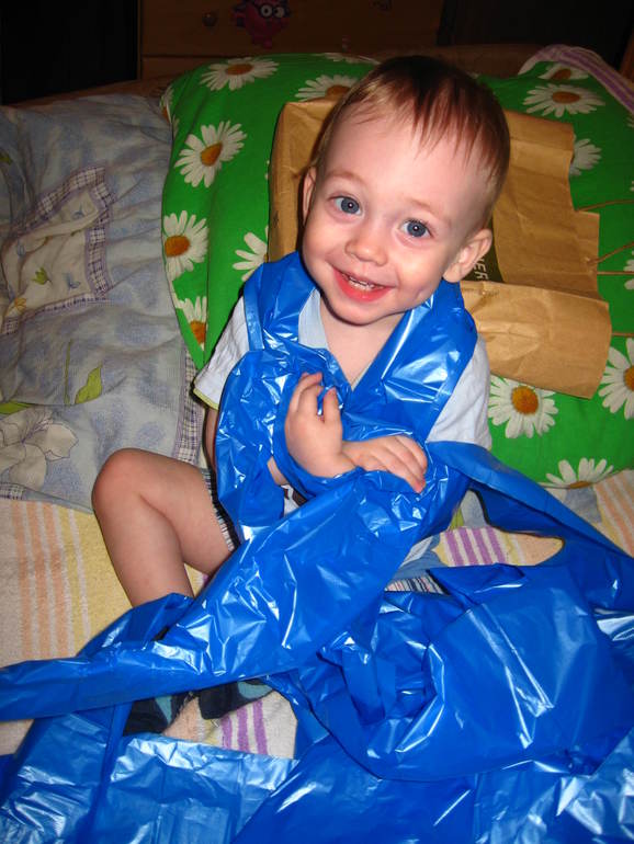Больше всего его привлекли пакеты. Он их раскручивал, шуршал ими, отрывал. Минут 15 был занят ими (я даже обед успела приготовить).