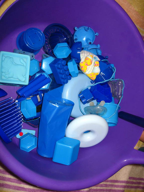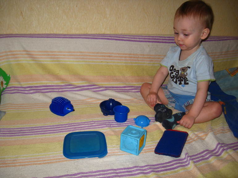 Пока завтракали, я разложила несколько синих предметов по дому. А Егор с ёжиком их искали и приносили на диван (процесс фотографировать не успевала, только результат). Вот всё собрано.