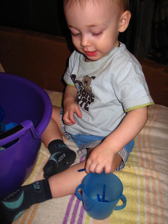После заплывов маме пришлось долго скручивать пакеты, Егор занимался игрушками, собирал счетные палочки в кружку.