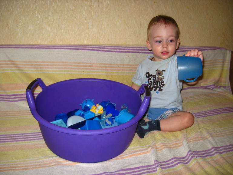 После этого (устал наверно) высыпал все на диван. Таз спустил на пол, сам лег на диван и начал с дивана кидать, целясь в таз. Почти все попало в цель, что не попало или выскочило нехотя собрал. Таз принес мне и показал на балкон (таз живет там) теперь и игрушки там лежат.