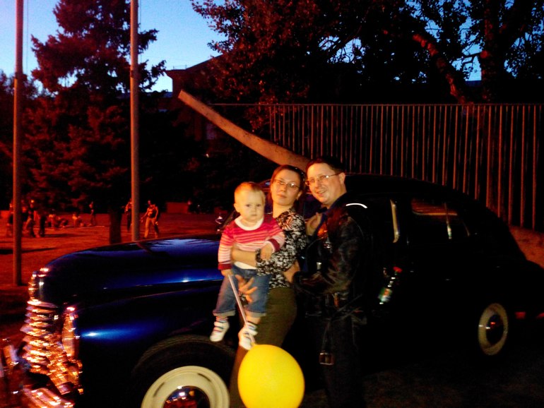 На тех выходных папка наш ездил участвовать в мероприятии под названием "моторы Сталинграда". со своим переделком. Вызвонил нас, поехали мы тоже.Там была выставка ретро автомобилей, прочей техники, концерт. Мы глазели, интересовались активно, танцевали (доча так смешно это делает и любит танцевать с мамой-папой вместе у них на руках =), после, когда закончилось, очаровали музыканта за ударной установкой и нас туда пустили =) все! Ребенок определился =) теперь барабаны - наше все!
