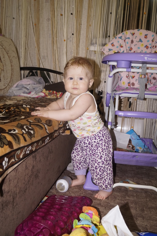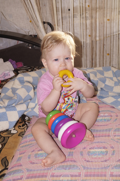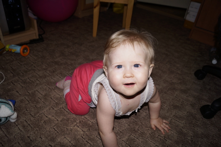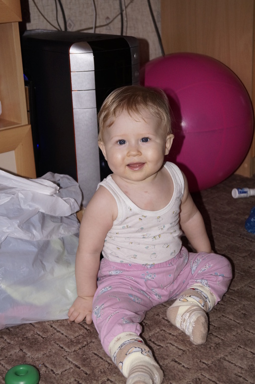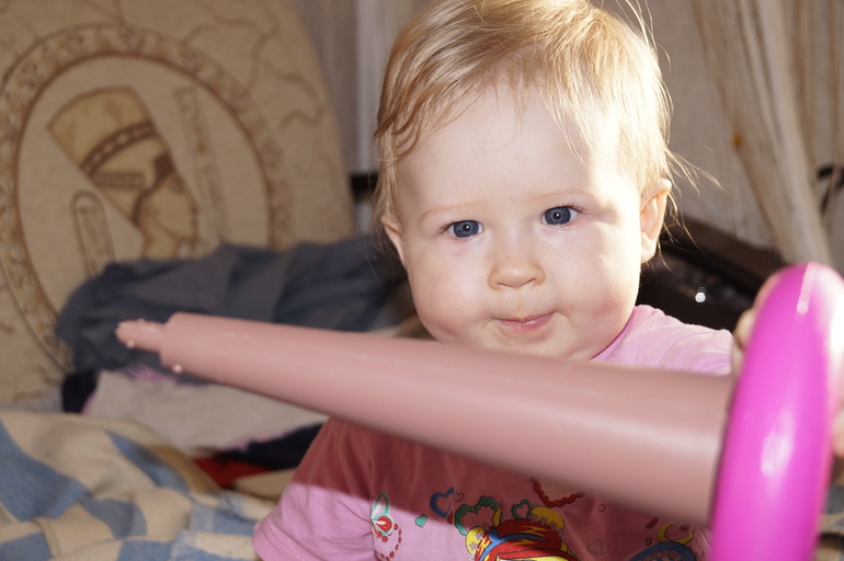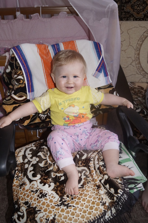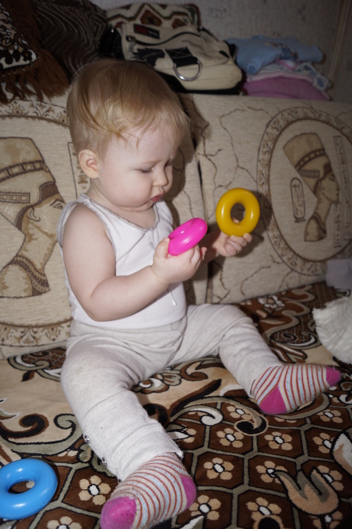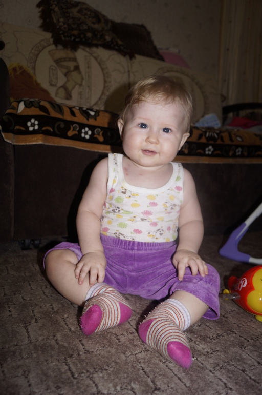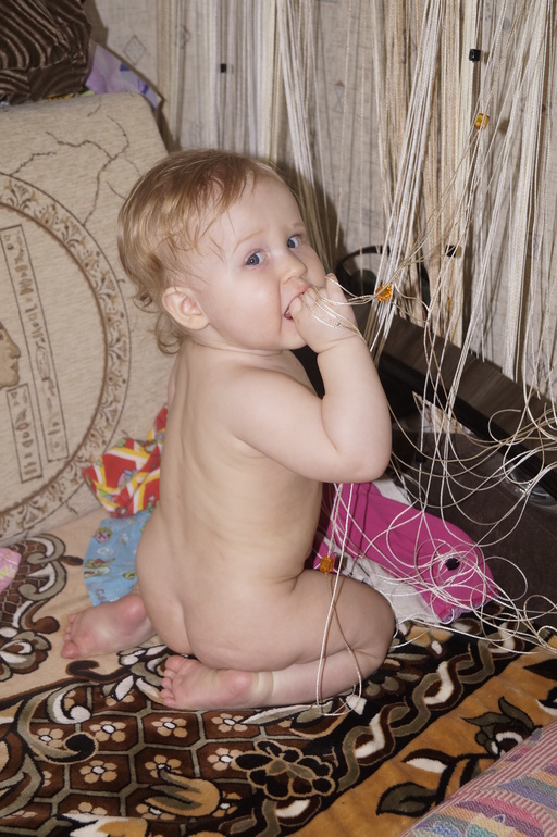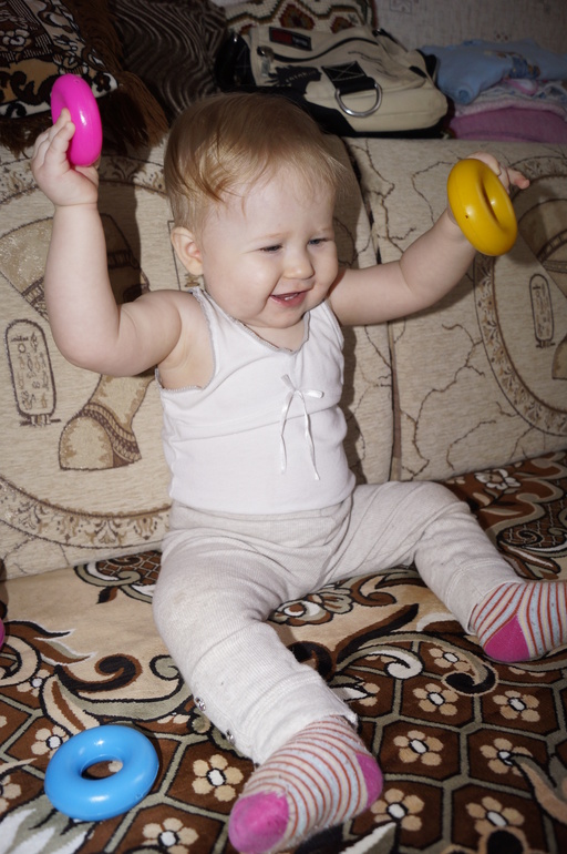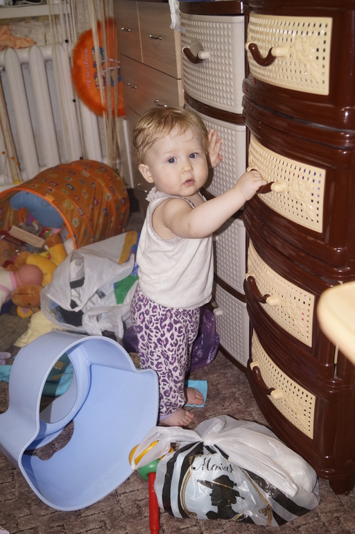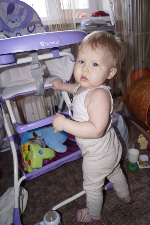 Постоянно в движении. Очень трудно чем-то заинтересовать её. Ну настоящий шилопопик!!! Видимо, достанется нам от неё за троих.