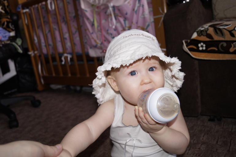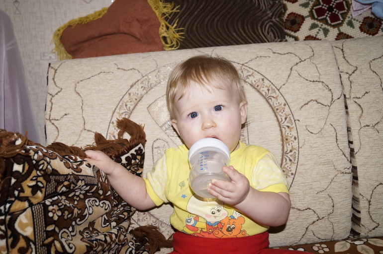 По-прежнему пьёт только воду. Бутылку держит сама.