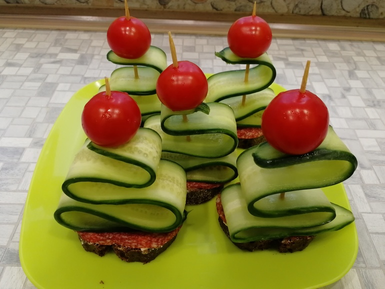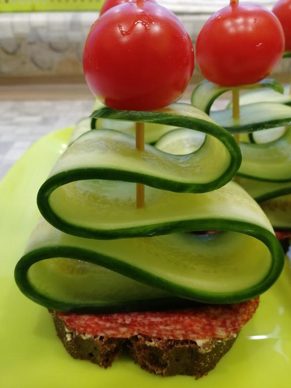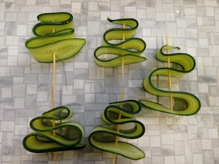 Свернуть огурец зигзагом, формируя елку, проколоть шпажкой:
