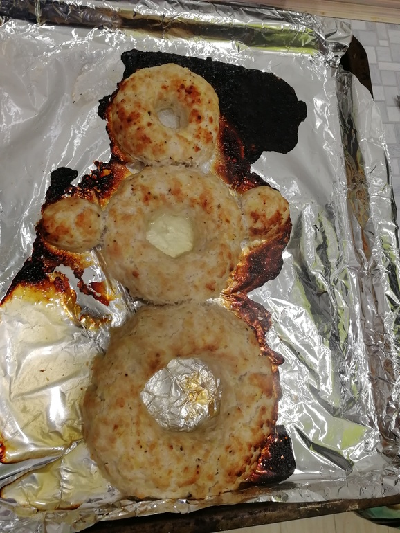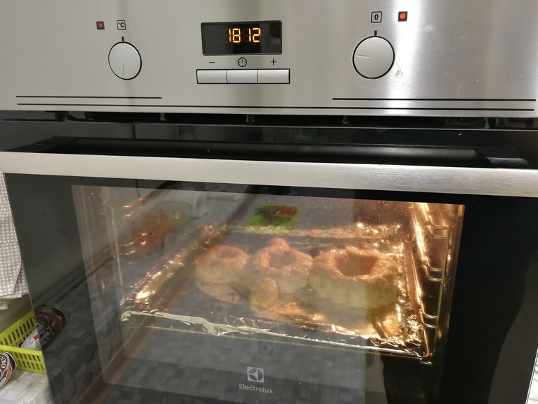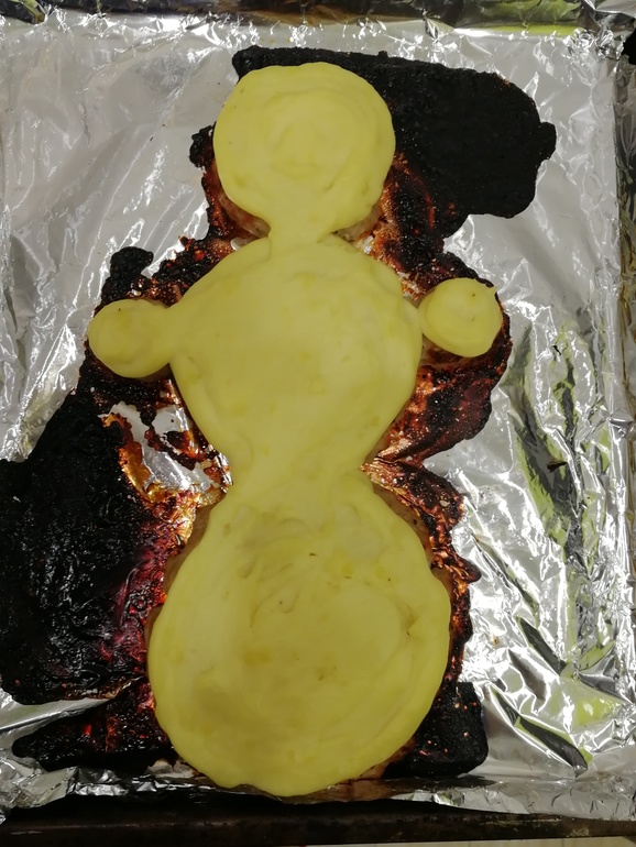 Достать из духовки противень. Вот именно из-за этой несимпатичности от выделившегося и подгоревшего сока и надо всё же перекладывать готового снеговика на блюдо: