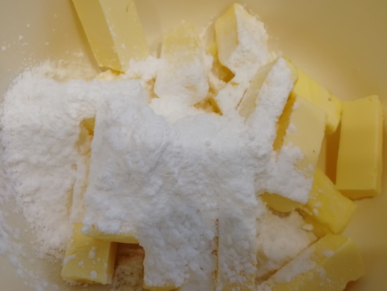 Поместить в чашу миксера 200 г мягкого сл. масла и 100 г сахарной пудры: