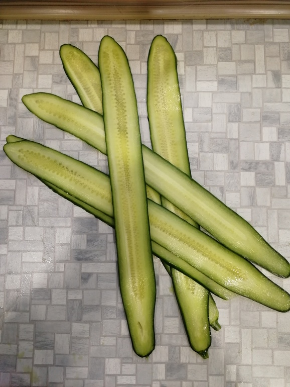 Длинноплодный огурец нарезать слайсами (я использую шинковку, подойдет овощечистка):