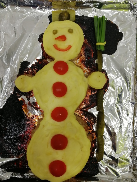 Запекать еще 5 минут. Украсить помидорками черри, сделать глаза из горошка, метелку из зеленого лука и огурца: