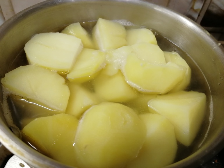 Слить воду, добавить горячие сливки и блендером сделать пюре: