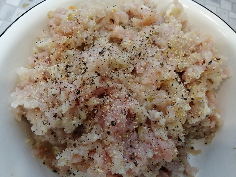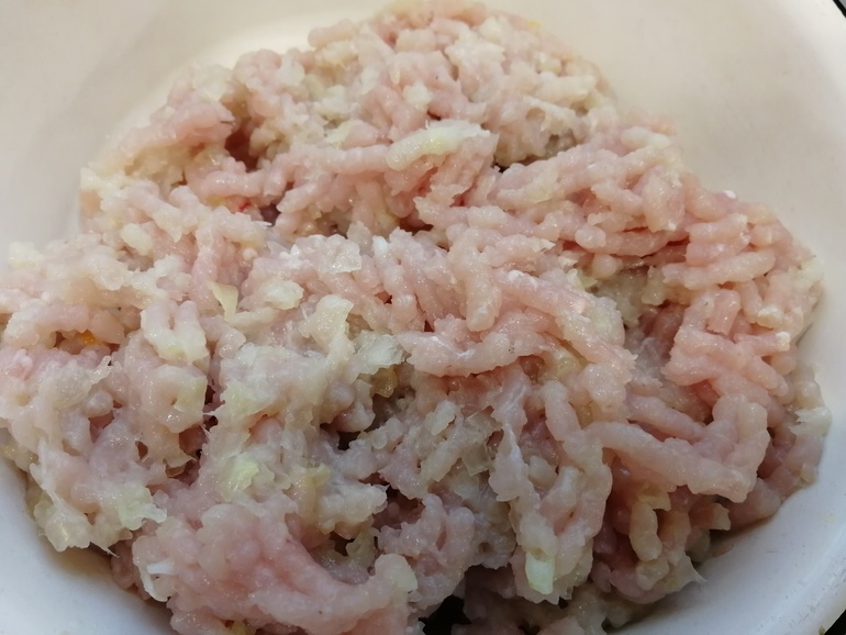 Смолоть 800 г филе грудки индейки (подойдет и курица, но белое мясо) и 2 луковицы: