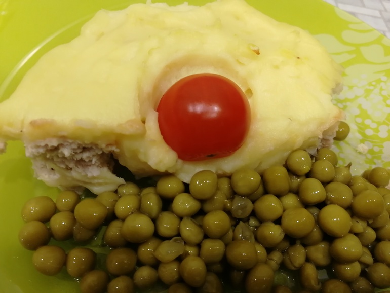 Оценен и съеден мгновенно, но подавать на противне на праздничный стол нельзя - перекладывать будем на блюдо. А пока в тарелках с горошком: