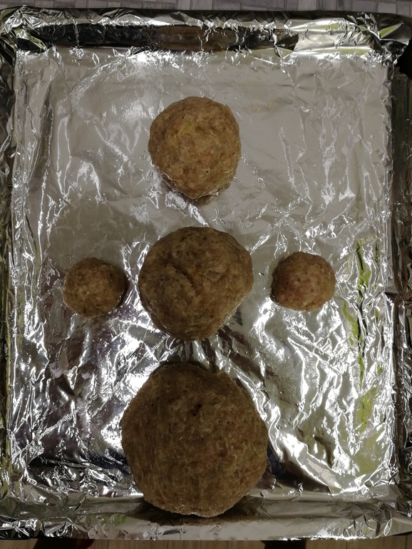 Перемешать и хорошенько отбить фарш. Разделить фарш на комочки, разложить на противне: