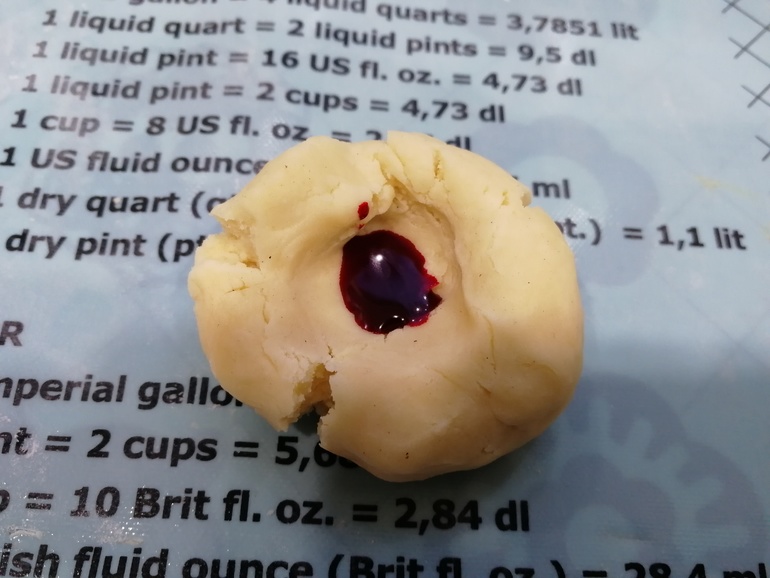 Отделить от теста кусок размером с яйцо, добавить в него несколько капель красного красителя, перемешать для получения розового цвета: