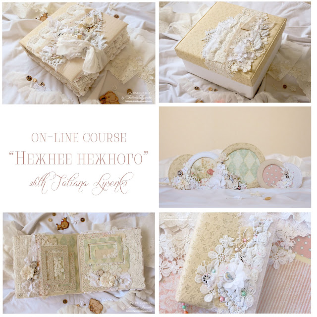 А еще в сентябре ждите анонс моего очередного он-лайн-курса - "Нежнее нежного". Он будет включать в себя целых 4 скрап-объекта:большой фотоальбом, коробка для фотоальбома, нестандартная круглая фоторамка на три места для фотографий и блокнот-анкета для вашего малыша. Некоторые из них вы можете посмотреть уже сейчас перейдя по ссылке, а некоторые я покажу вам в самое ближайшее время ;) Обещаю, что будет информативно, динамично, нежно и красиво!