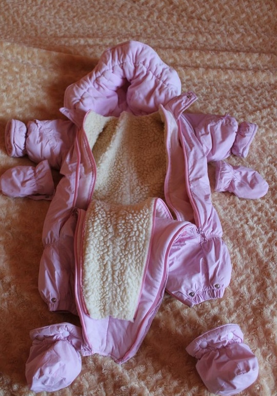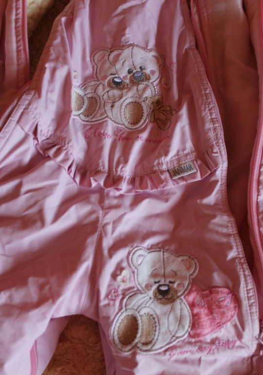 Детский комбинезон-трансформер Janmar, производство Польша. Нежно розового цвета, размер указан 68-74, с набивным (пришит) рисунком "Мишки". Носили только в коляске. Два в одном: весна-осень и зима. На зиму подстёжка из натуральной овчины (с разделёнными ножками), отдельно варежки без пальчиков, пинетки, все пристёгивается. Зимой очень тепло ребенку, учитывая, что есть подстёжка внутри самого комбеза, который и так на утеплителе. Материал верха гладкий, хорошо моется. Внутри капюшона приятный мягкий материал, напоминает велюр, форма - колпак. Носил один ребенок, один сезон, поэтому состояние идеальное, нет не потёртостей, не рваный, не застиранный, без пятен.