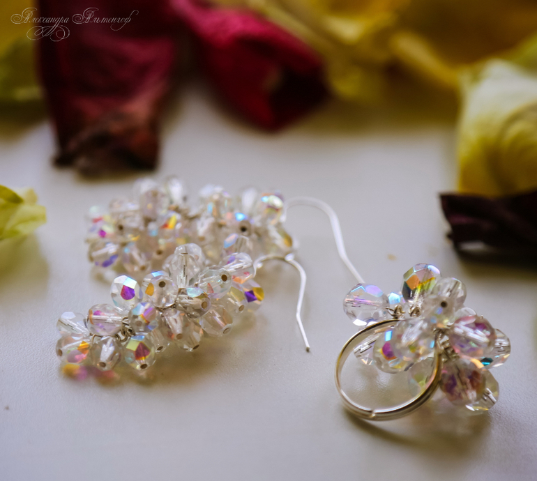 В комплекте использованы Граненые бусины (стекло) разного размера, производство - Чехия, цвет - радужный, хрусталь.