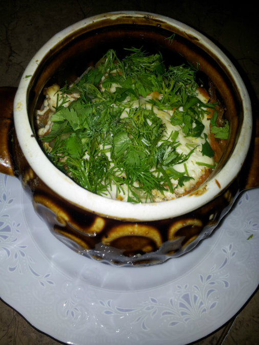 Делаю все обычно))) Мясо нарезаю кубиками, картошку также (отдель варю до полу-готовности и даже чуть меньше), марковку потереть, можно добавить грибы (сегодня их не было дома, поэтому без них), специи, чесночка чуток для аромата. Заливаю картофельным отваром, сверху майонез и в духовку на минут 40. Перед подачей посыпать зеленью!!! Очень нравится нам всем это блюдо!!!!