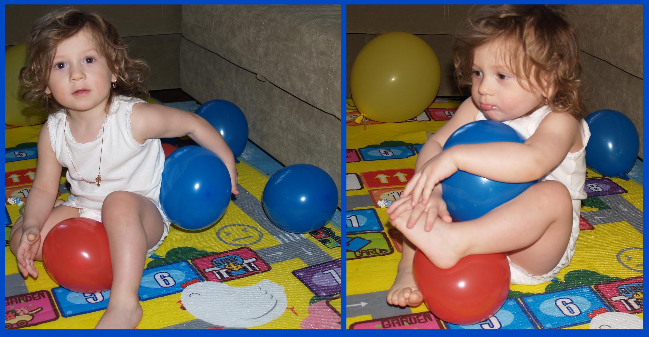 Для начала надули шарики и стали играть. Взяла парочку красных, чтобы вспомнить цвет с прошлой недельки.