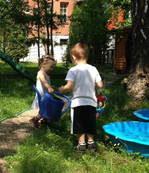 Вот такую чудесную площадку родители подарили нашим малышам ))) Обычно дети дерутся за качелю, а сейчас Ваня качает Анюту.