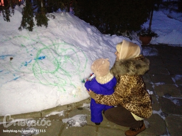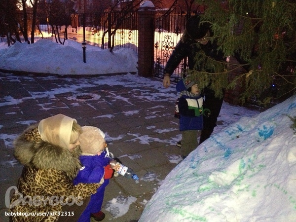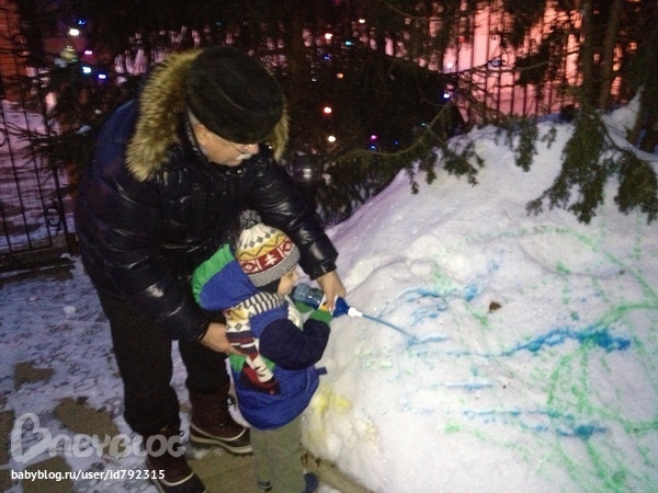 Потом мы пошли красить сугробы - Ванечка с дедом, Аннушка со мной, а папа фотал (хотя уже вечерело и фотки конечно так себе). Дети сначала не поняли, что это мама затеяла, а потом хотели еще ))