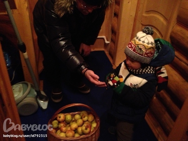 Я все равно замерзла и уговаривала Ванечку пойти уже домой, но он не слушая рванул к бане. Оказывается во время каждой прогулки они с дедом заходят в баню и берут там зимнее яблочко - и только после того, как оно будет съедено вместе с дедушкой и Крафтом - можно идти домой )) Как же это мило! ))