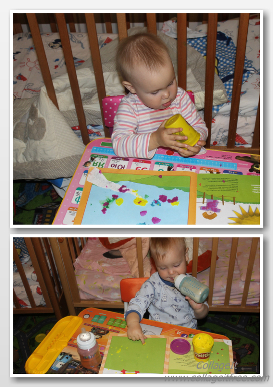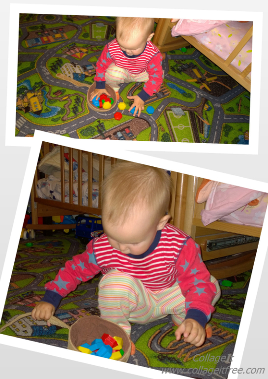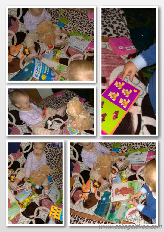 После прогулки мы поиграли в то, что мишка идёт в гости и рассыпал свои ягодки и шишки, а Иринка помогла ему собрать их, Серёжка был в этот момент занят.
