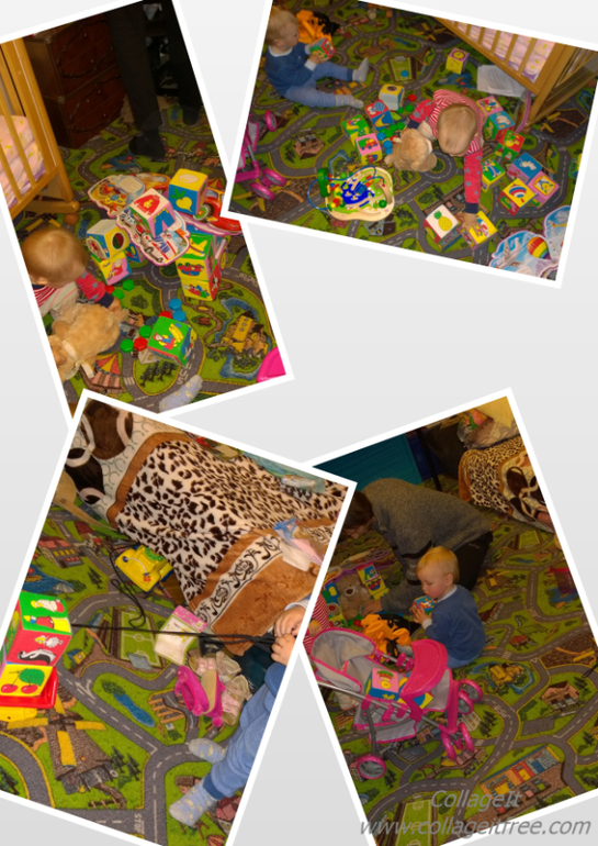 И в заключение вечера мы строили большой дом для мишки. Получилось так, что папа придумывал дизайн, а Иринка с Серёжкой возили кирпичи-кубики: Иринка на коляске, а Серёжка на машине. После завершения строительства дом был немного развален, а потом и разбросан :)