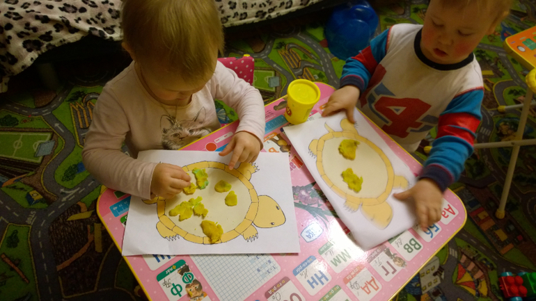 А также мы творили черепаху, у нас мало было пластилина жёлтого, но мы использовали его весь :) потом я просила выбрать только жёлтое из мешочков только жёлтое и прикрепить к пластилину, получилось у нас не очень красиво, но зато жёлтым точно позанимались :)