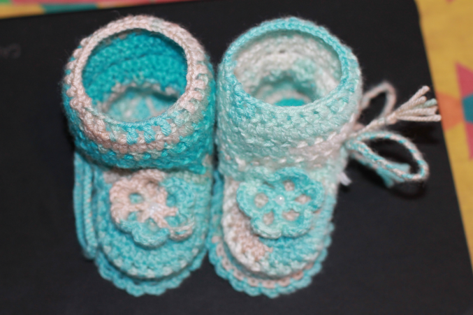 Ниточка разноцветная. Эти пинетки под тот пледик который я так же вязала в подарок и картинка которого у меня есть на странице чуть ниже.