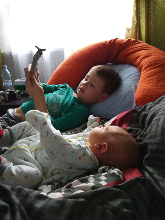 Режима как такового у малыша пока нет, привыкаем друг к другу, стараемся соблюдать интервалы кормёжки и бодрствования. Сложно конечно, когда маленький полдня на руках, а Федяю хочется мне что то показать, поиграть, просит включить мультики и тп, так что учусь всё делать одной рукой)) стараюсь Федюню привлекать к домашним делам, он любит выполнять всякие задания (вчера вот "рифадельки" лепили на борщ, пока Миша спал) или я кормлю мелкого, а старший рядом сидит с книжкой, смотрим ролики про китов и подводных монстров) Мишаню как "помеху" пока не воспринимает, гладит его, уговаривает не плакать) вечером помогает купать-в его компетенции измерить температуру воды и дать добро))