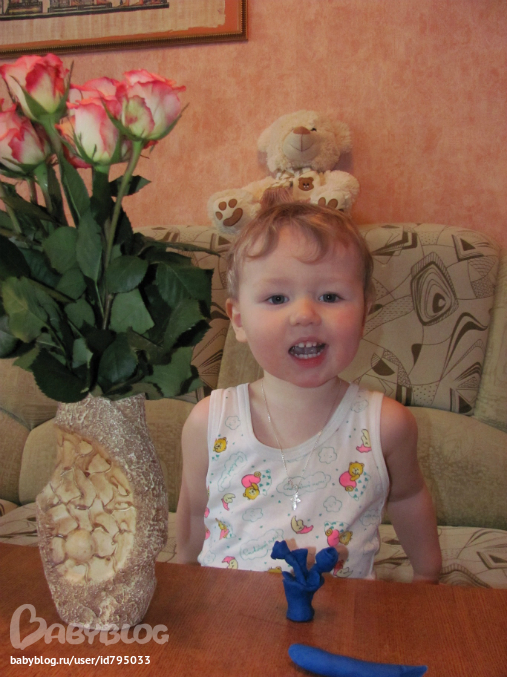 ЗЫ: Тимошке так понравились цветочки, разбирали с ним где у розы бутон, где стебель и листья, почему они стоят в воде. А потом лепили розы, налили в вазу воды и вот что получилось