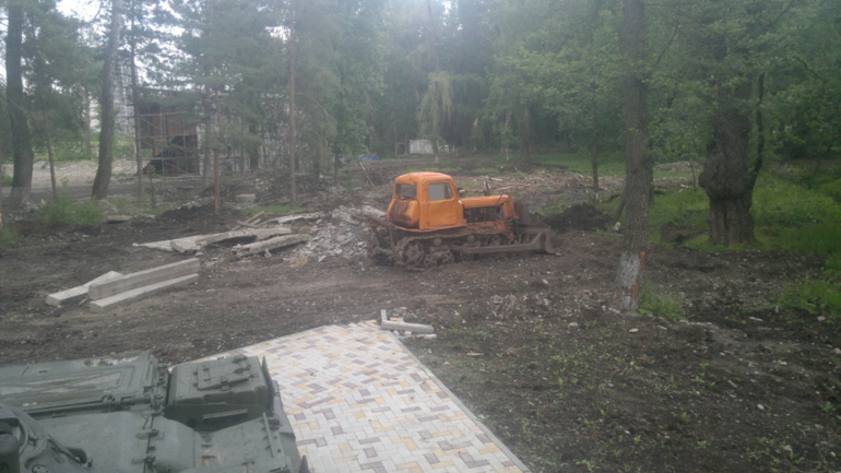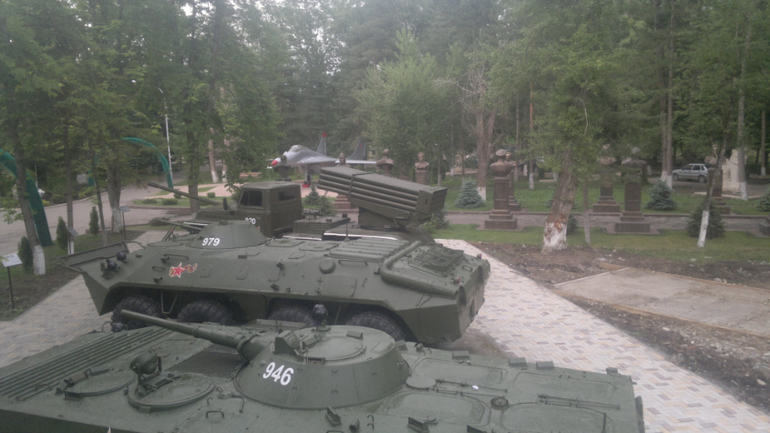 Аллея Славы. Изначально здесь был 1 танк, его сюда перенесли со въезда в город, а на его место поставили стеллу-символ нашего города. А к 2015 году автопарк разросся