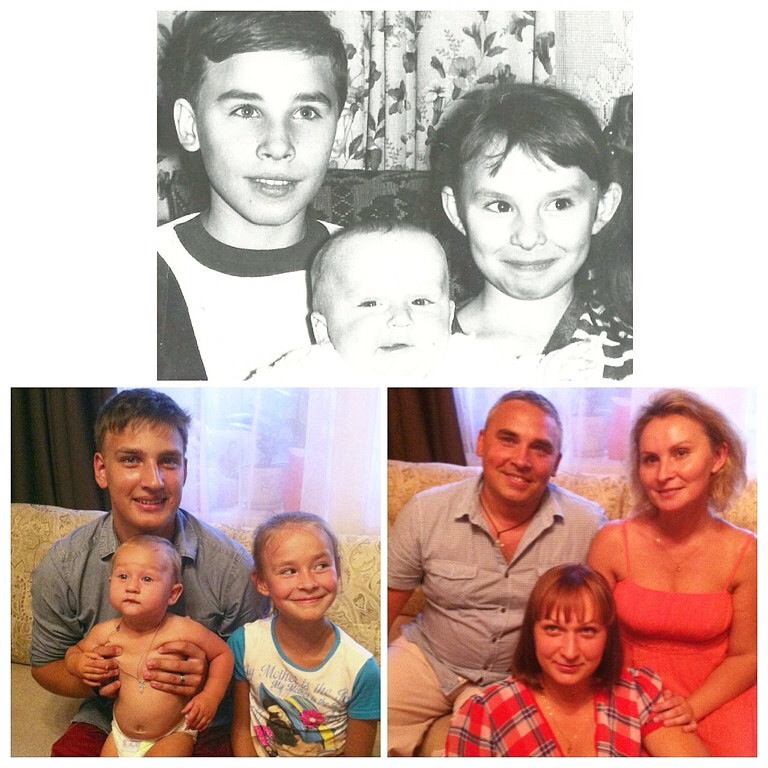 А это фото реставрация)) на фото мой брат, сестра и я маленькая, далее 20 лет спустя мы же, и наши дети
