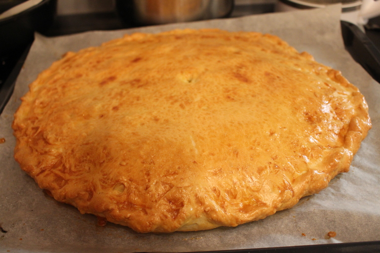 разделить на 2 части, одна больше, другая чуть меньше, раскатать лепешку и положить на противень смазанный маслом, раскатывать сильно не надо чуть, на противине руками растянуть нужно до нужного размера, примерно диаметр 40см , выложить начинку( начинка может быть любая на ваш вкус, у меня грибы, капуста фарш, лук, морковь, перец, соль) отлично пирог для рыбной начинки, очень вкусно!