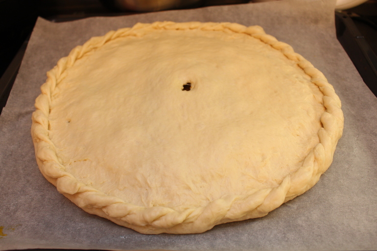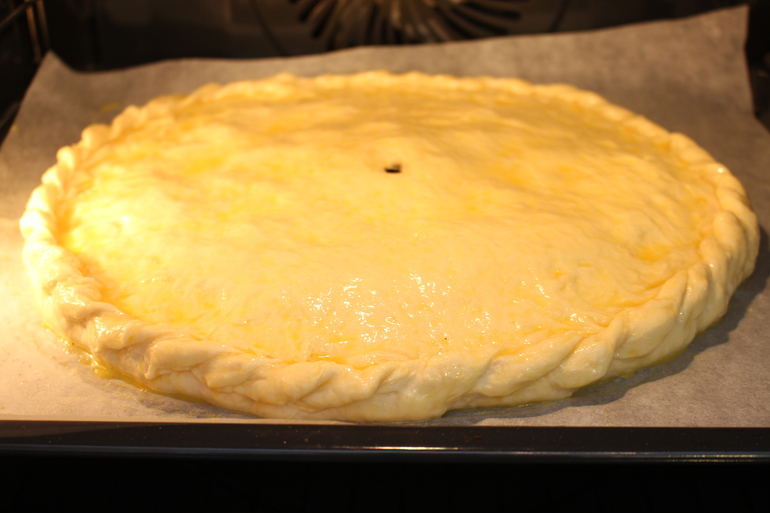 раскатать чуть другой кусок теста и положить сверху на пирог, и так же растянуть до краев, защипывая края сразу, сначала сделать шов, а потом его можно фигурно украсить. в середине сделать дырочку для воздуха.