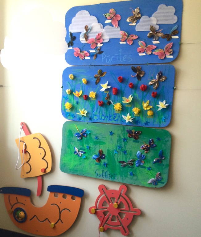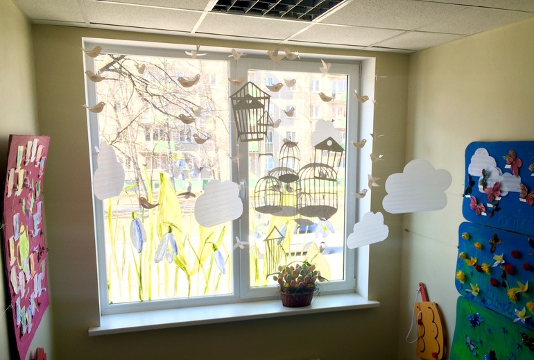 В нашем саду тоже украшено красиво , по весеннему , детские поделки в холле