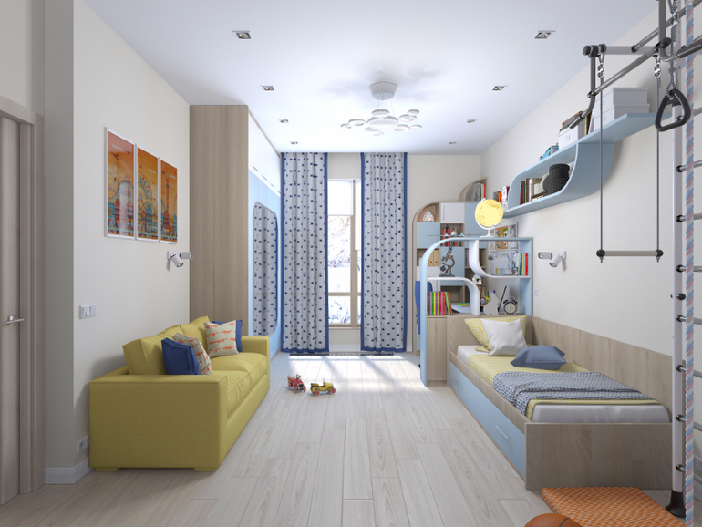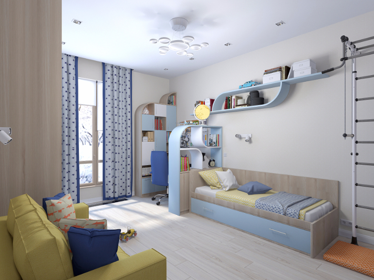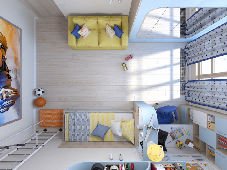 Необходимо: светлое, но уютное пространство, современный футуристичный интерьер, никакого зеленого цвета!) Нужен большой шкаф, много места для хранения, место для игрушек (модельки), спортивный уголок, диван, письменный стол.