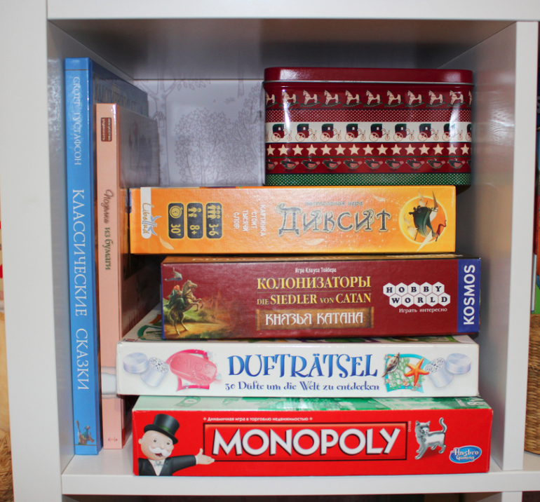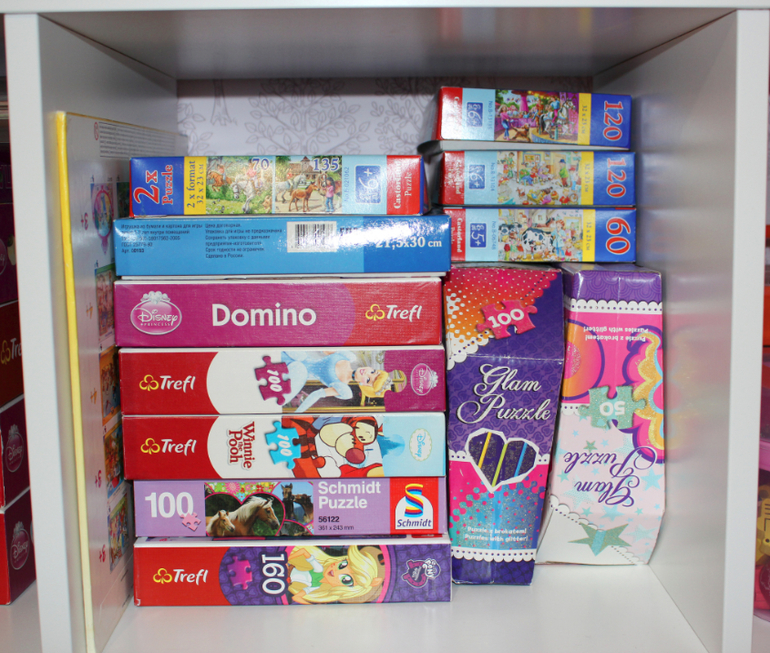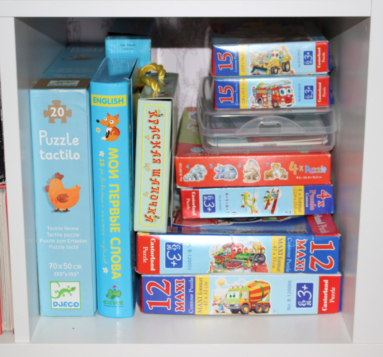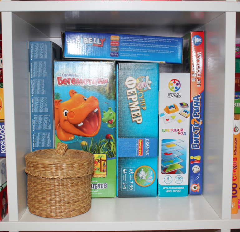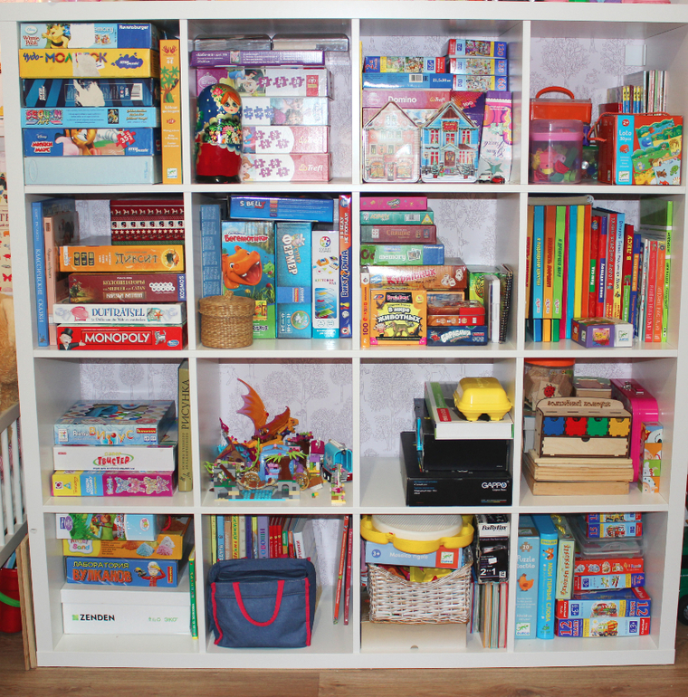 Этот стеллаж - игровой. Тут игры, пазлы, игрушки и развивашки.