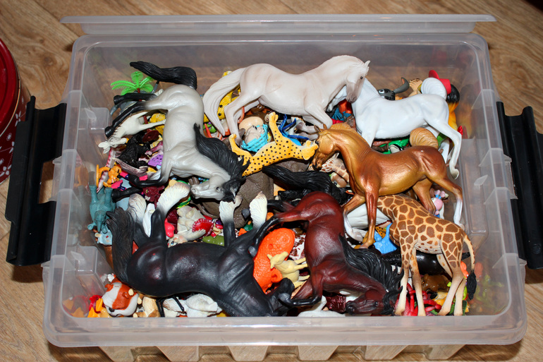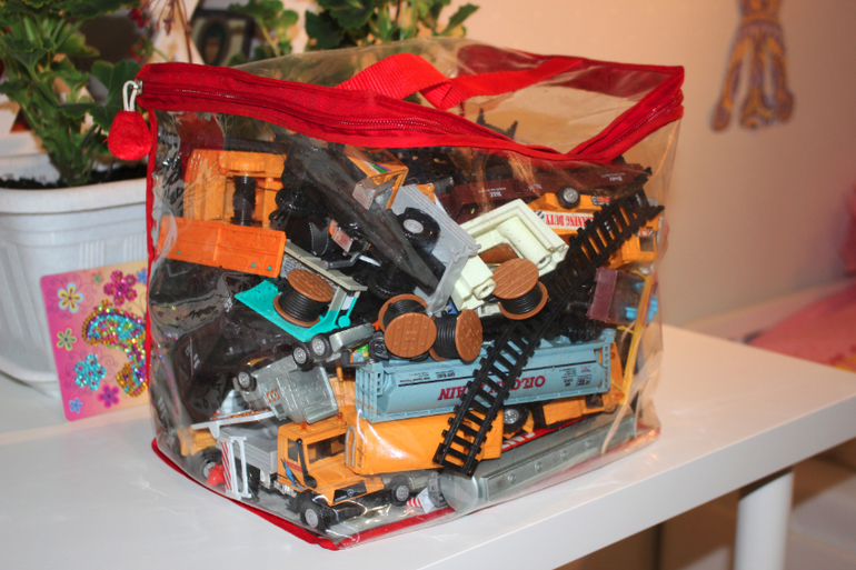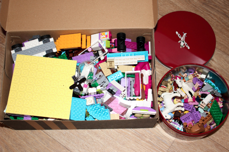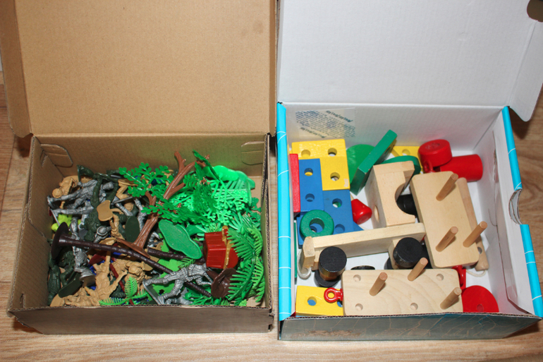 В большой коробке из-под лего - всякая мелочевка от плей-до, дальше - песок, ленты, ткани, упаковочная бумага, сверху на коробке - пара картин на холсте...