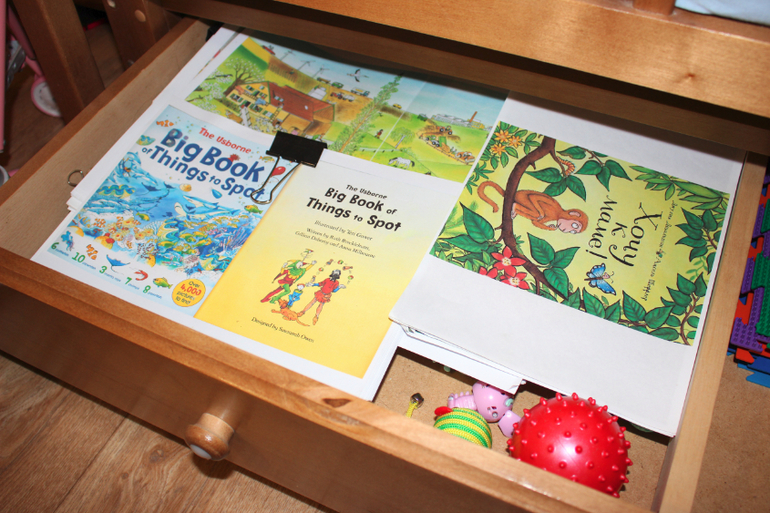 В ящике Гошиной кроватки - распечатки, коврики массажные тоже там периодически лежат.