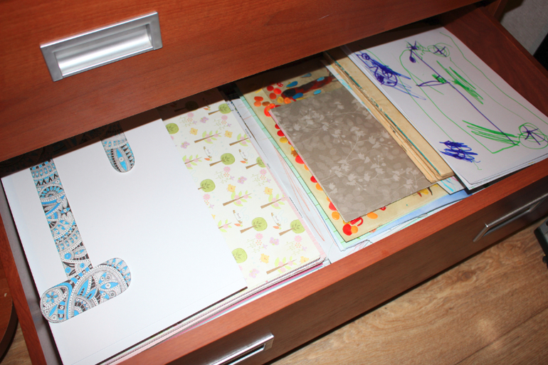 Это ящик комода с запасами бумаги - скрап, формат А3, всякая разная - цветная, фактурная, бархатная...