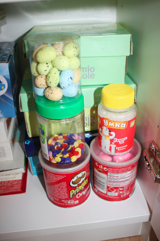 Еще у нас целая полка в кухне, там наши крупы для игр и сенсорных коробок, пересыпалки, баночки, емкости, формочки для печенья, для льда, красители, крахмал, соли разнообразные для купания и экспериментов и куча всего прочего.