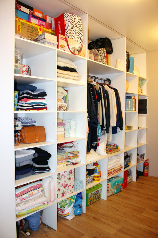 Это в большом шкафу в прихожей несколько глубоких полок выделено для хранения всякой всячины, тут все стоит в 2-3 ряда.