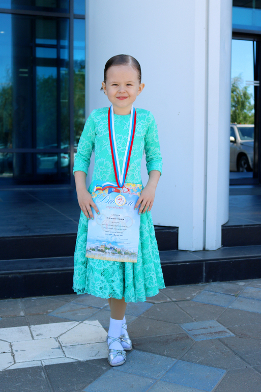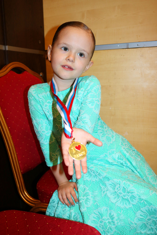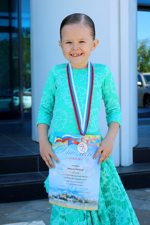 Кстати ,была замечательная организация соревнований ,чудесное музыкальное сопровождение. Мы просто наслаждались! Провели с доченькой несколько часов только вдвоем)!) Ну конечно же, мы заняли 1 место! Нам уже назад нельзя!))) Женя умница просто!!!! У нее и внешность ,фигурка, грация! Что нужно. Будем продолжать, расти. Все лето у нас тренировки, танцуем уже 7 танцев, с сентября будем соревноваться на 4 танца и на кубки отдельно. Это только успевать теперь везде!)))
