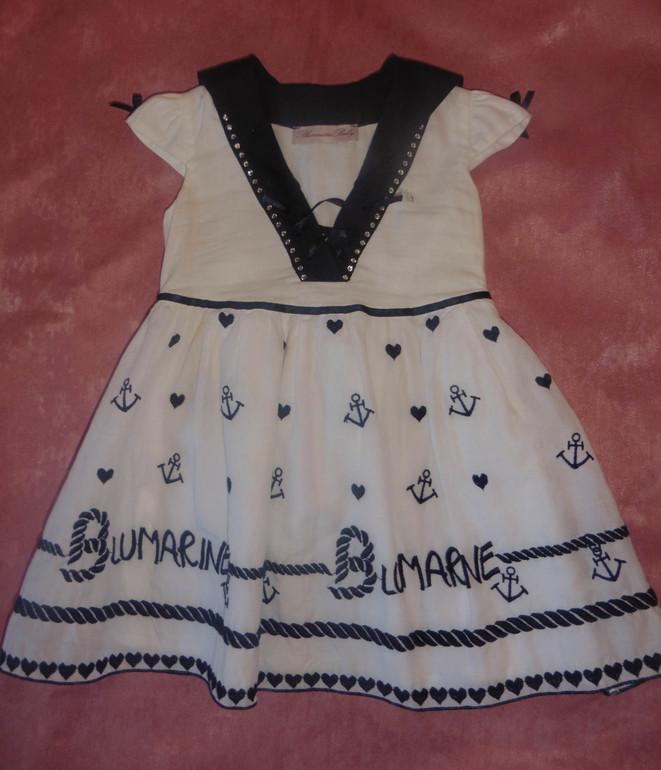2. Платье в морском стиле, по вороту стразы, на спине металлическая подвеска "В" Маломерит!!! До роста 82 на неполную девочку.